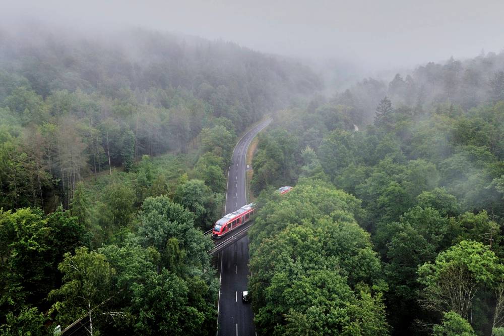A hydrogen train drives through a forest of the Taunus region Frankfurt, Germany, on July 21. (The Associated Press)