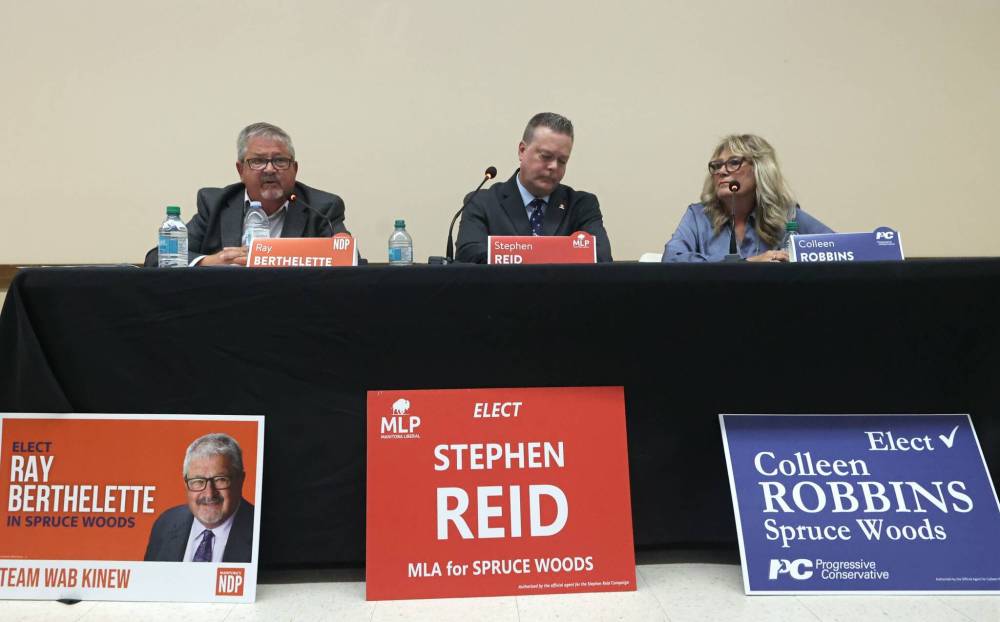 The three Spruce Woods provincial byelection candidates attend Wednesday’s debate at the Sprucewoods Community Hall near CFB Shilo. From left: New Democrat Ray Berthelette, Liberal Stephen Reid and Progressive Conservative Colleen Robbins. (Matt Goerzen/The Brandon Sun)
