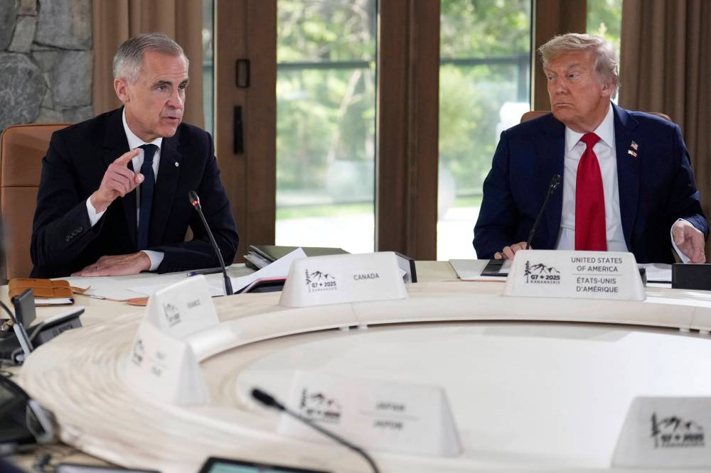 Prime Minister Mark Carney and U.S. President Donald Trump participate in a session of the G7 Summit in Kananaskis, Alta., in June. (The Associated Press files)
