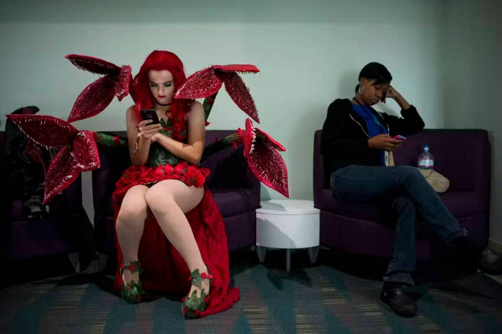 A woman whose character name is Poison Ivy looks at her smartphone while taking a break at Stan Lee’s Los Angeles Comic Con held at the Los Angeles Convention Center in 2016 in Los Angeles. (The Associated Press files)