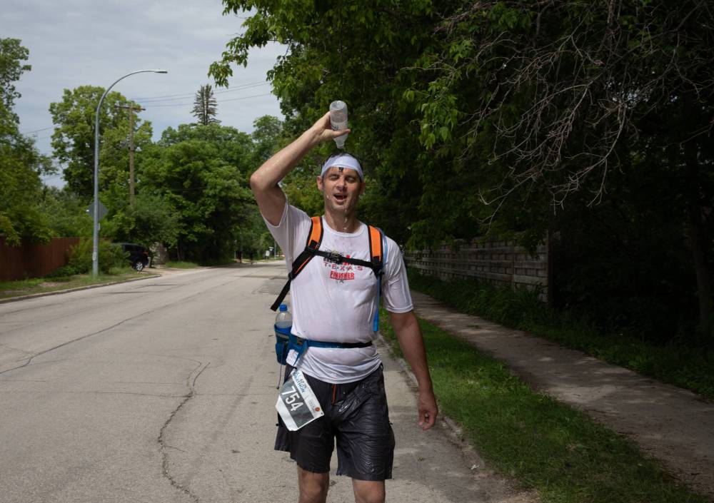 A runner closing in on the finish of the Manitoba Marathon pours water on his face on June 19. The race was cancelled due to extreme heat, though many runners still finished the marathon and half marathon. (Winnipeg Free Press)