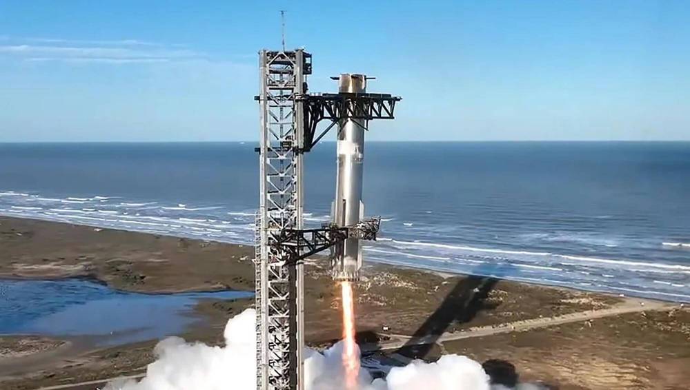 A SpaceX Starship Super Heavy booster makes a successful return, caught at the launch tower in Boca Chica, Texas, on Jan. 16. Elon Musk's SpaceX is locking up much of the U.S. government's space business. (SpaceX)