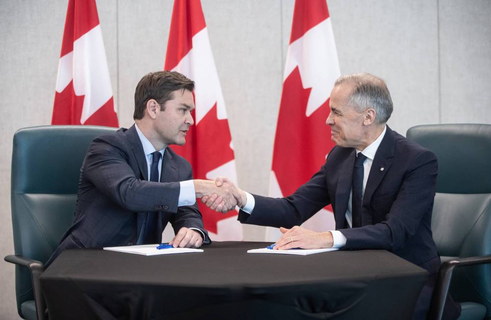 Prime Minister Mark Carney (right) and MP Matt Jeneroux shake hands in Edmonton last month after Jeneroux crossed the floor to the Liberals. (The Canadian Press files)