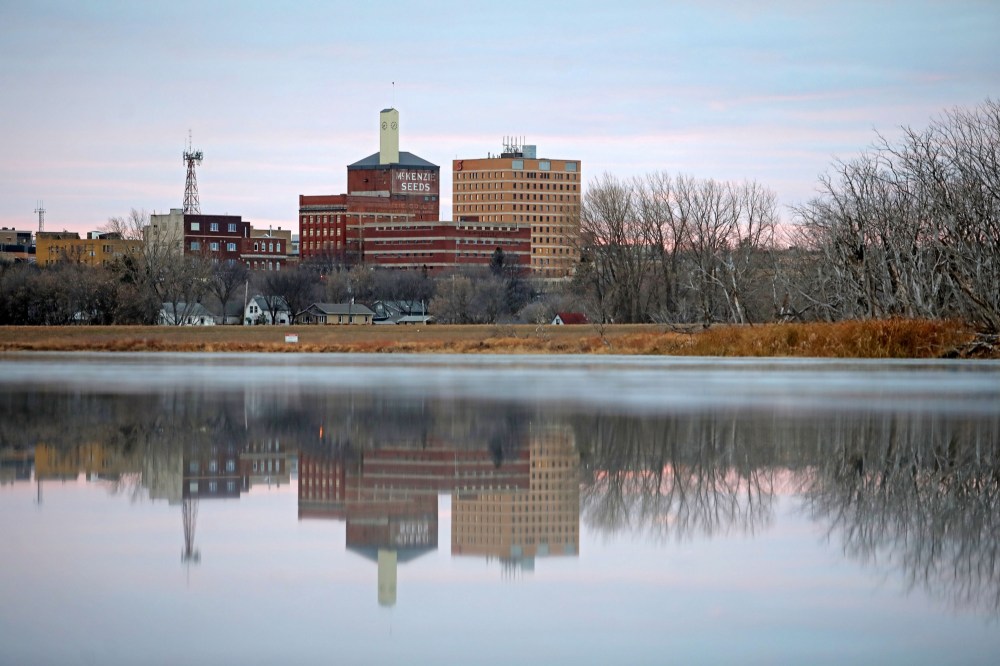 The McKenzie Seeds building and Scotia Towers in downtown Brandon are reflected in the ice on the Assiniboine River in Brandon.