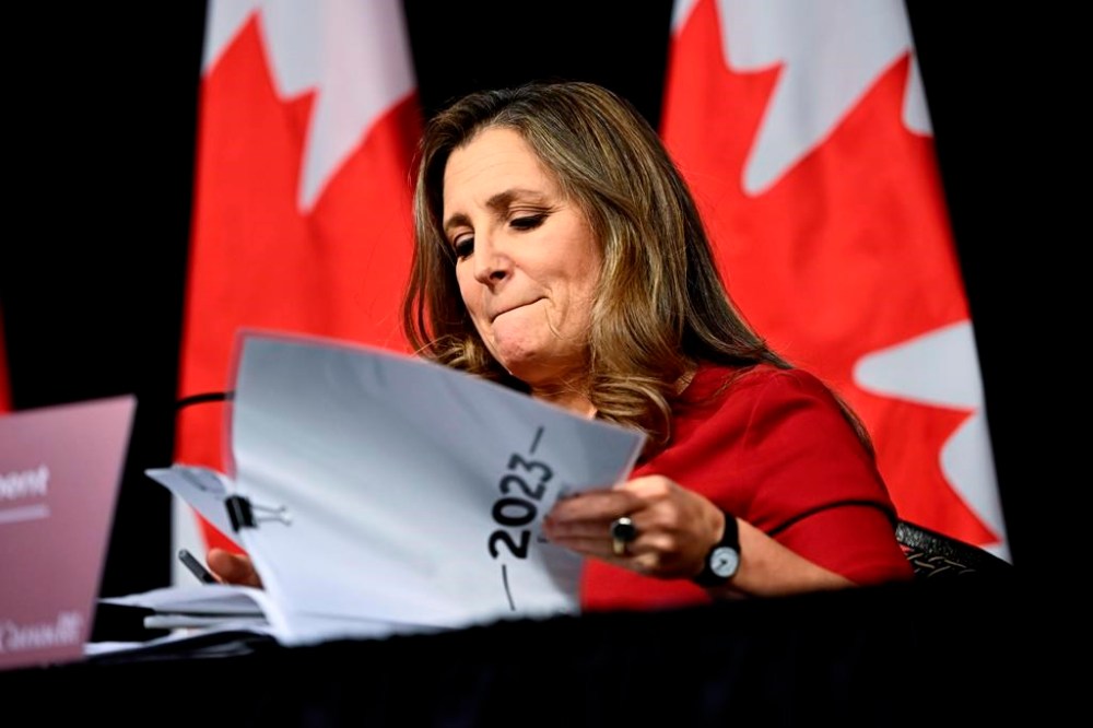 Minister of Finance Chrystia Freeland arrives at a news conference before the tabling of the Fall Economic Statement, in Ottawa, on Tuesday, Nov. 21, 2023. THE CANADIAN PRESS/Justin Tang