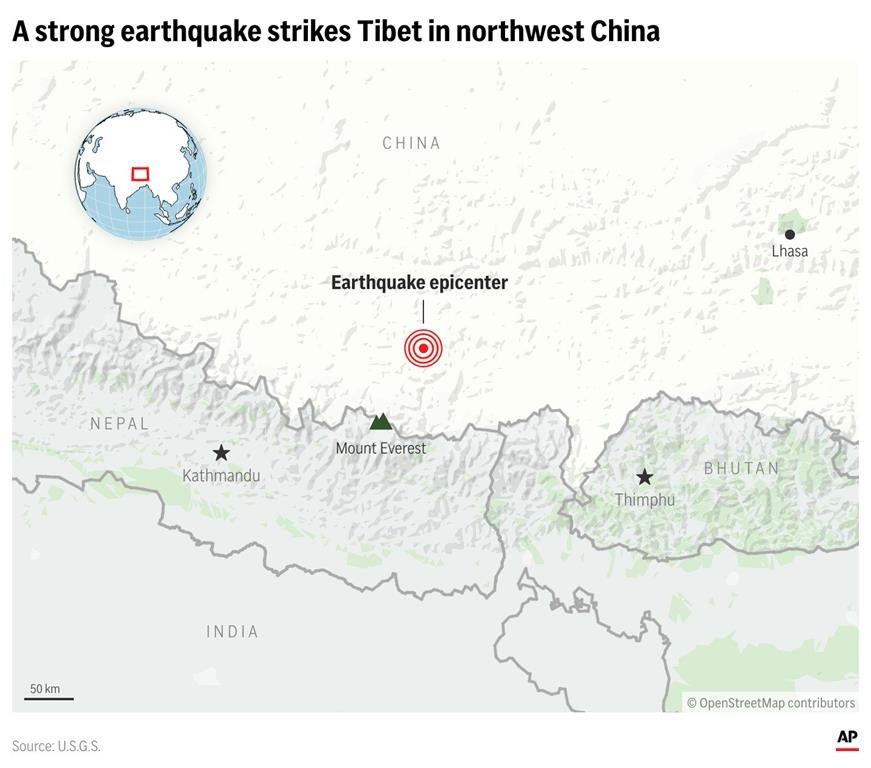The epicenter was in Tibet’s Tingri county, where the India and Eurasia plates grind against each other and can cause earthquakes strong enough to change the heights of some of the world’s tallest peaks in the Himalayan mountains.