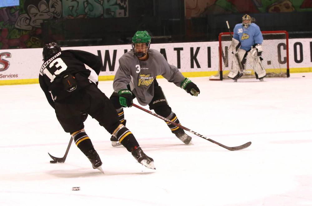 Flower Mound, Texas product Ethan Gonyeau (3), shown defending against Marlen Edwards (13) at Brandon Wheat Kings rookie camp on Thursday morning at J&G Homes Arena, wants to earn a spot with the team and play in Canada this winter. (Perry Bergson/The Brandon Sun)