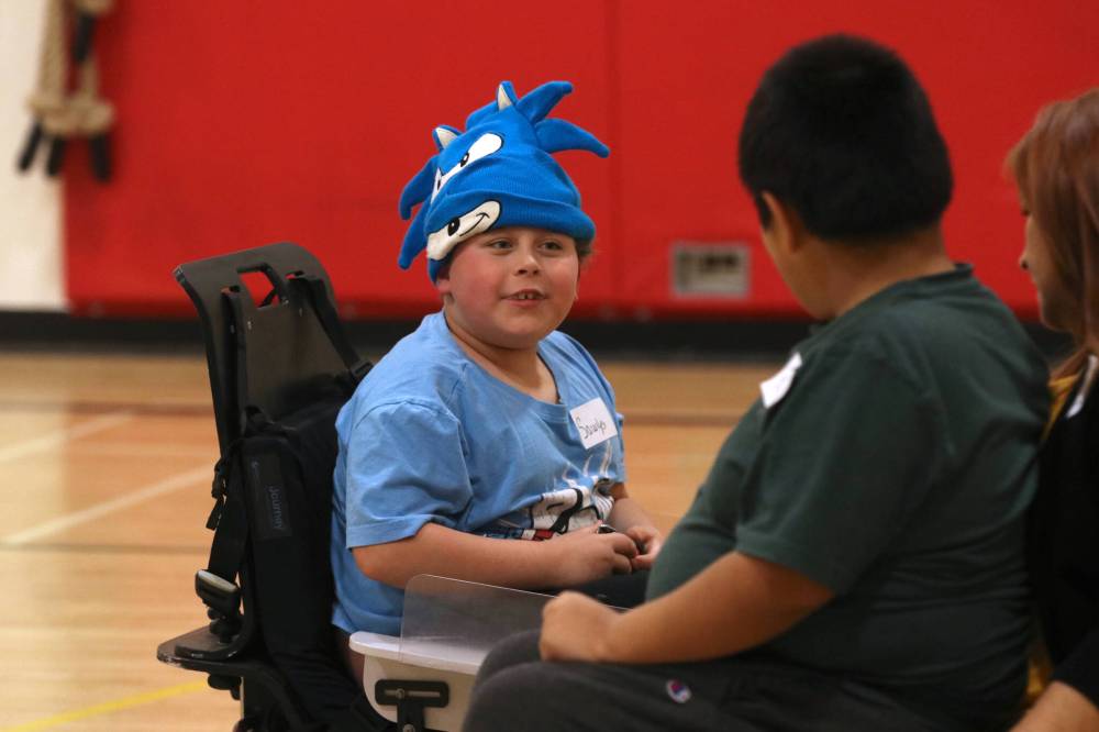 The youngsters, who can be joined in the chair by an adult if needed, are surrounded by yellow T-shirts in the gymnasium, with an incredible volunteer-to-participant ratio.