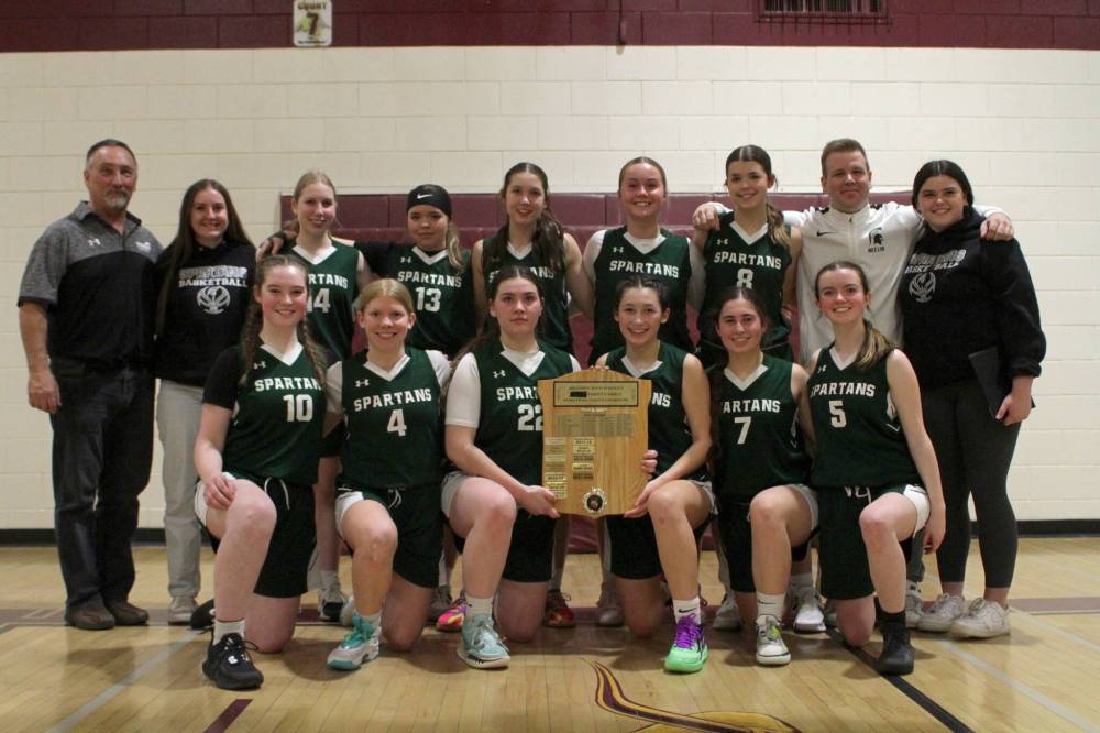 The Neelin Spartans hold the Brandon High School Basketball League varsity girls plaque after beating the host Crocus Plainsmen 56-49 in Game 3 of the final on Tuesday. (Thomas Friesen/The Brandon Sun)