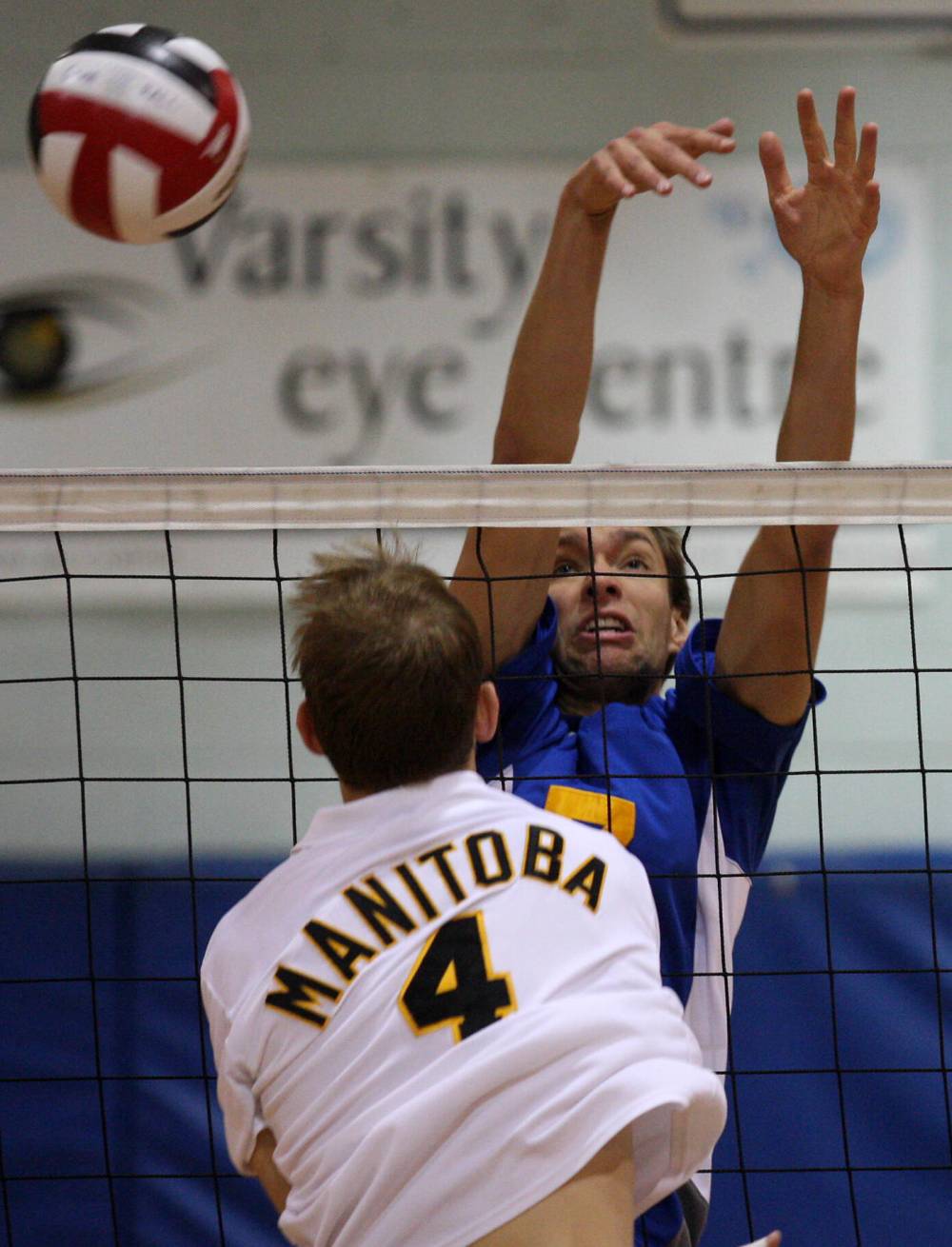 Shaun Funk, shown blocking a Manitoba Bison in 2008, spent four years with the Brandon University Bobcats men’s volleyball team. (Tim Smith/The Brandon Sun)