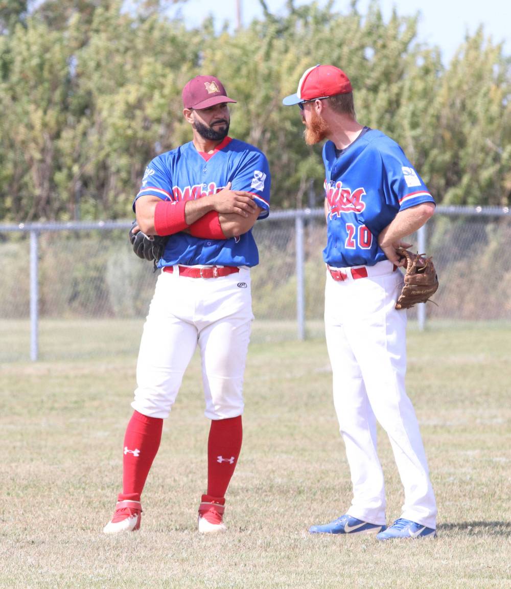 Winkler Whips infielders Manny Lantigua and Travis Friesen (20) chat during a break in the play at AA provincials in Rivers last summer. The Whips picked up Lantigua from the Morden Mud Hens for the tournament. Morden fell in the Border Baseball League final to Cartwright. (Perry Bergson/The Brandon Sun)