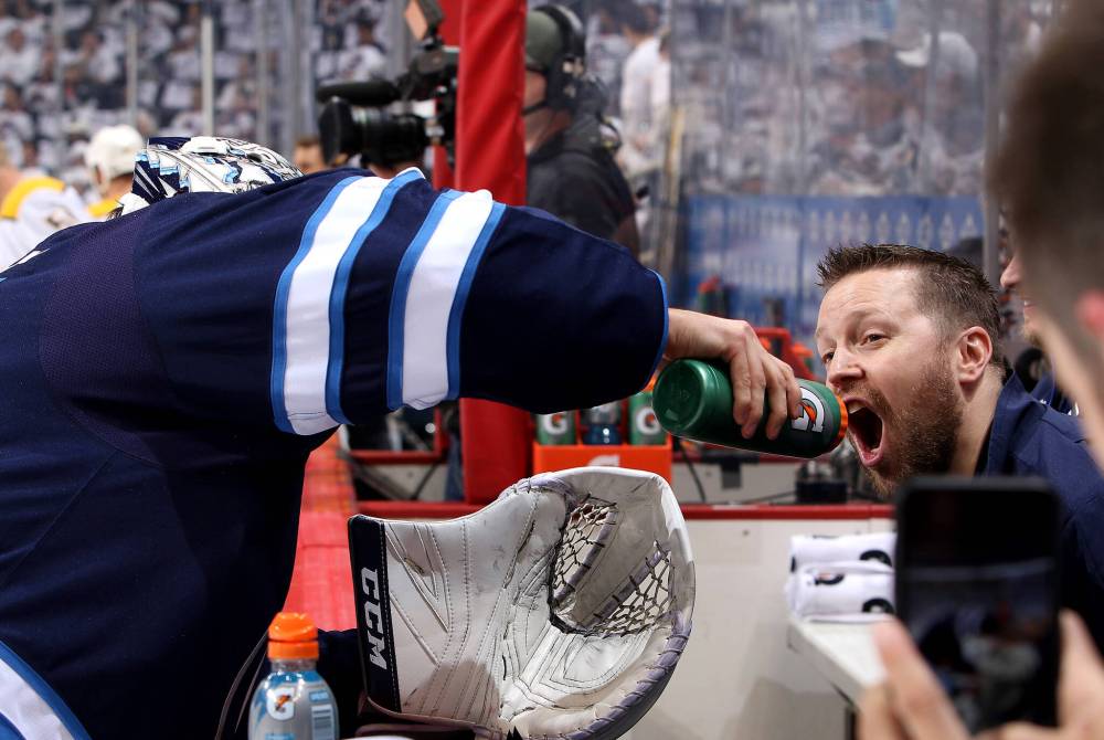 Goaltender Connor Hellebuyck of the Winnipeg Jets helps assistant athletic therapist Brad Shaw stay hydrated during pre-game warmup of their National Hockey League playoff game against the Nashville Predators in 2018 . (Photo by Jonathan Kozub/NHL)