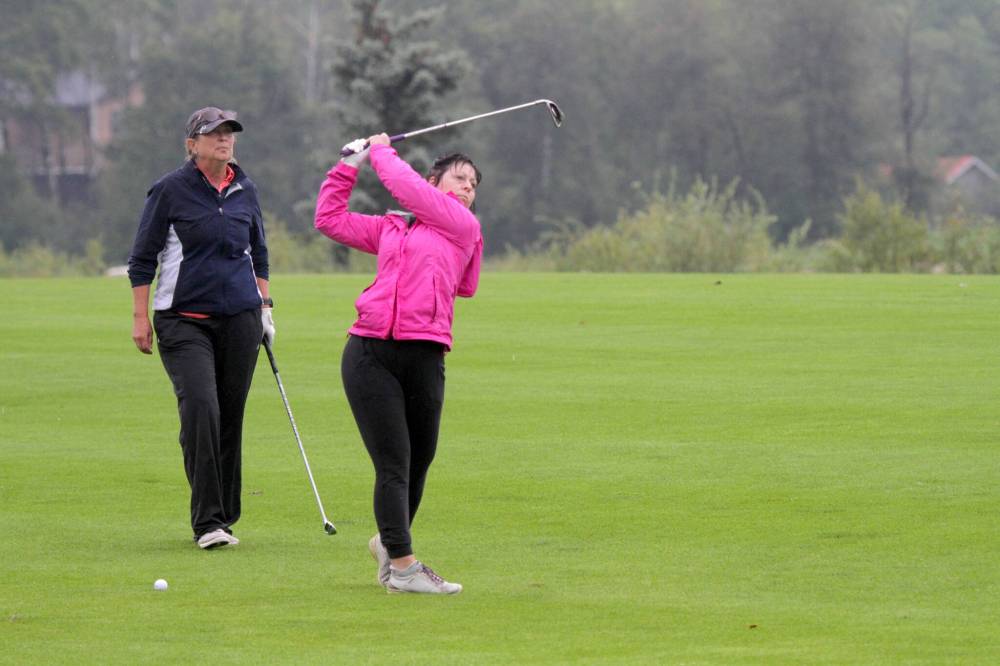 Chanda Rauch hits a shot while teammate Theresa Snyder looks on. The Tamarack held matches at Poplar Ridge for the first time this year, shifting the senior men’s and ladies’ scramble quarters to the Onanole track.