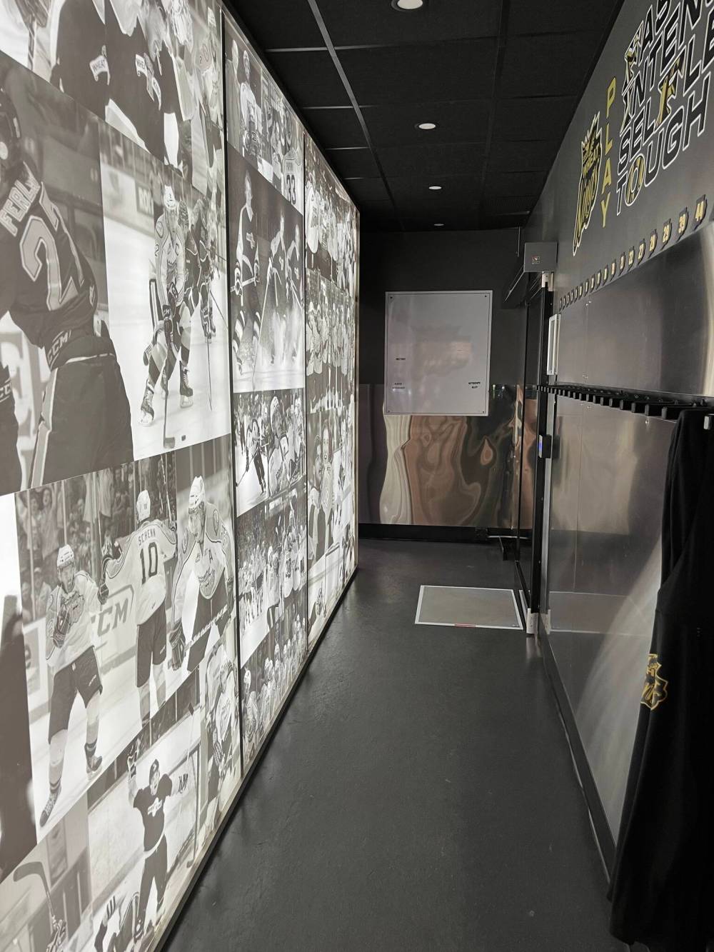 The hallway between the dressing room and the dry room also features team history. The players leave the room to come down to the ice through an electronic door by the mat on the floor. (Perry Bergson/The Brandon Sun)