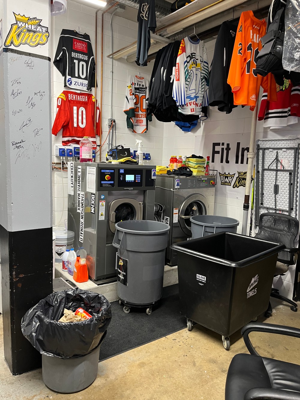 The laundry facilities can be found with equipment storage off the hallway heading to the north rinks, across from the wall of fame. The laundry used to be in the Exhibition Hall, which was a long hike, especially when you’re wheeling a giant container of aromatic hockey gear and towels.