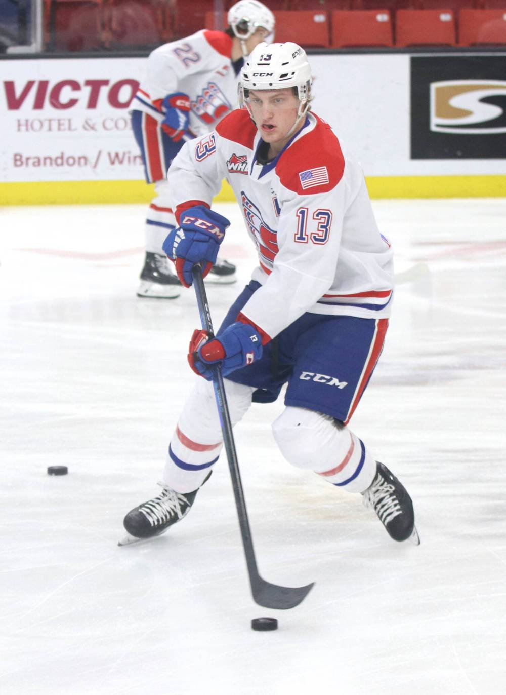 Spokane Chiefs forward Grady Lane, shown during warmup prior to a game against the Brandon Wheat Kings on Dec. 10, 2022, returned to Westoba Place for the first time since he played with the under-15 AAA Southwest Cougars. (Perry Bergson/The Brandon Sun)
