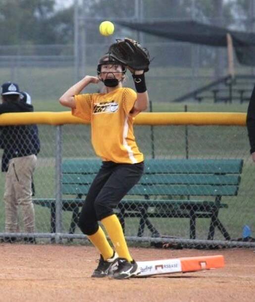Brooke Hartman catches a ball at first base while playing with the Brandon Heat. The 11-year-old softball player said she worked hard to improve from being "not the greatest player." (Submitted)