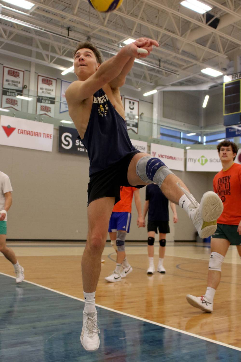 Paycen Warkentin passes a ball during BU men's volleyball practice on Thursday. (Thomas Friesen/The Brandon Sun)