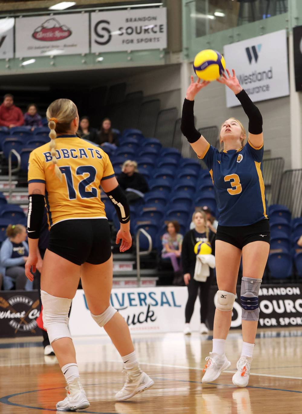 Brooklyn Pratt of the Brandon Bobcats sets the ball against the University of Fraser Valley Cascades at the Healthy Living Centre on Friday evening. (Photo by Tim Smith/The Brandon Sun)
