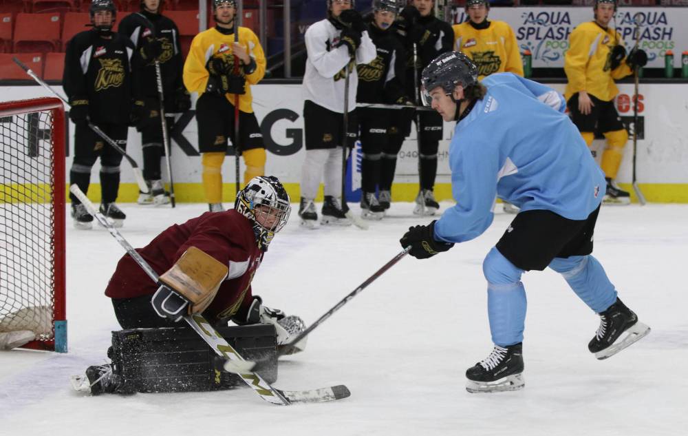 Goalie Carson Bjarnason denies forward Jayden Wiens during a drill at Brandon Wheat Kings practice at Westoba Place on Friday afternoon where the two nets were moved to the blue-lines and the teams played three-on-three plus a goalie. (Perry Bergson/The Brandon Sun)