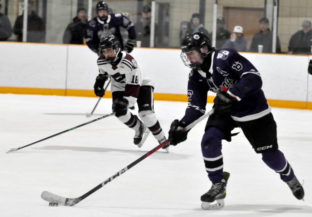 Vincent Massey Vikings power forward Carter Dittmer (7) has a league-best 24 goals and 42 points, good for third in the WHSHL scoring race. (Photo Jules Xavier/The Brandon Sun)