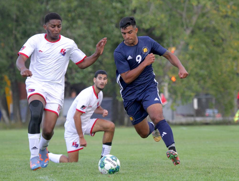 Camilo Rodriguez, right, claimed his second straight MCAC MVP award after recording 15 goals and six assists in the regular season. Rodriguez scored in both playoff games. (Thomas Friesen/The Brandon Sun)