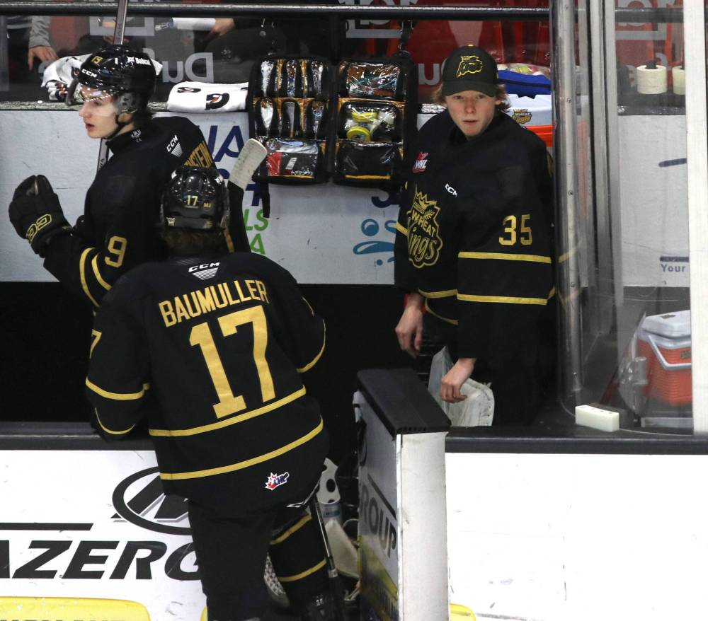 Brandon Wheat Kings emergency backup goaltender Dylan McFadyen opens the gate for Carter Klippenstein (19) and Joby Baumuller (17) during Sunday's loss to the Medicine Hat Tigers at Westoba Place.