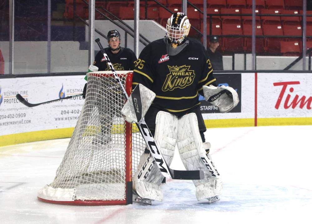 Brandon Wheat Kings emergency backup goaltender Dylan McFadyen, with defenceman Luke Shipley (27) in the background, takes the net during warmup prior to Sunday's game with the Medicine Hat Tigers at Westoba Place. He is helping the team out as starter Carson Bjarnason heals from a lower-body injury. (Photos by Perry Bergson/The Brandon Sun)