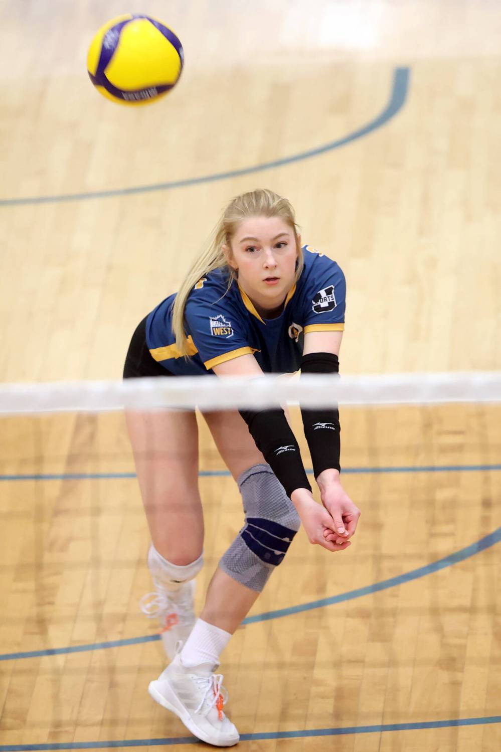 Brandon Bobcats libero Brooklyn Pratt digs the ball towards the net during Canada West women's volleyball action against the Mount Royal Cougars at the Healthy Living Centre on Friday night.