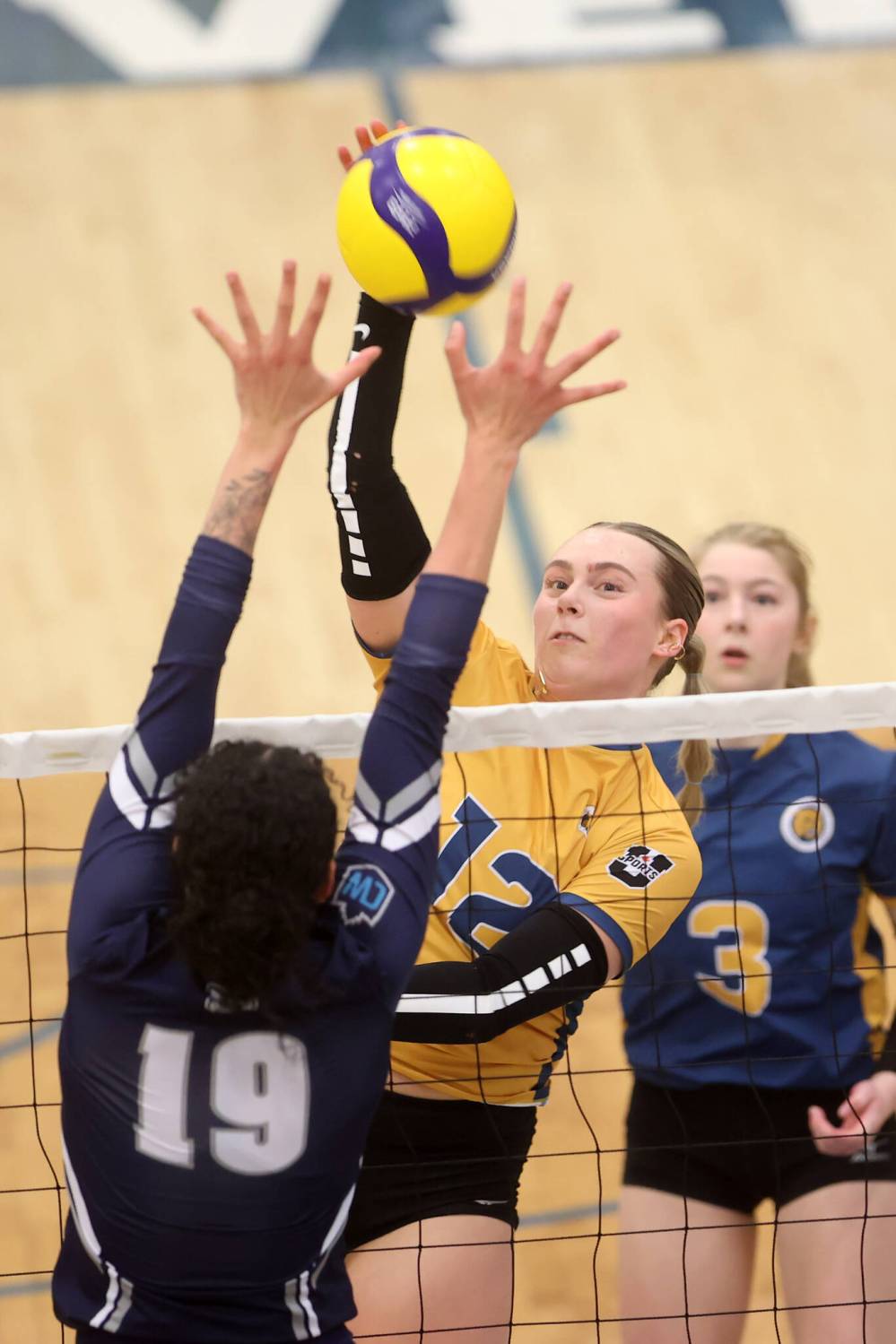 In a battle at the net, Brandon Bobcat Avery Burgar spikes the ball past Mya Morgan of the Mount Royal Cougars.