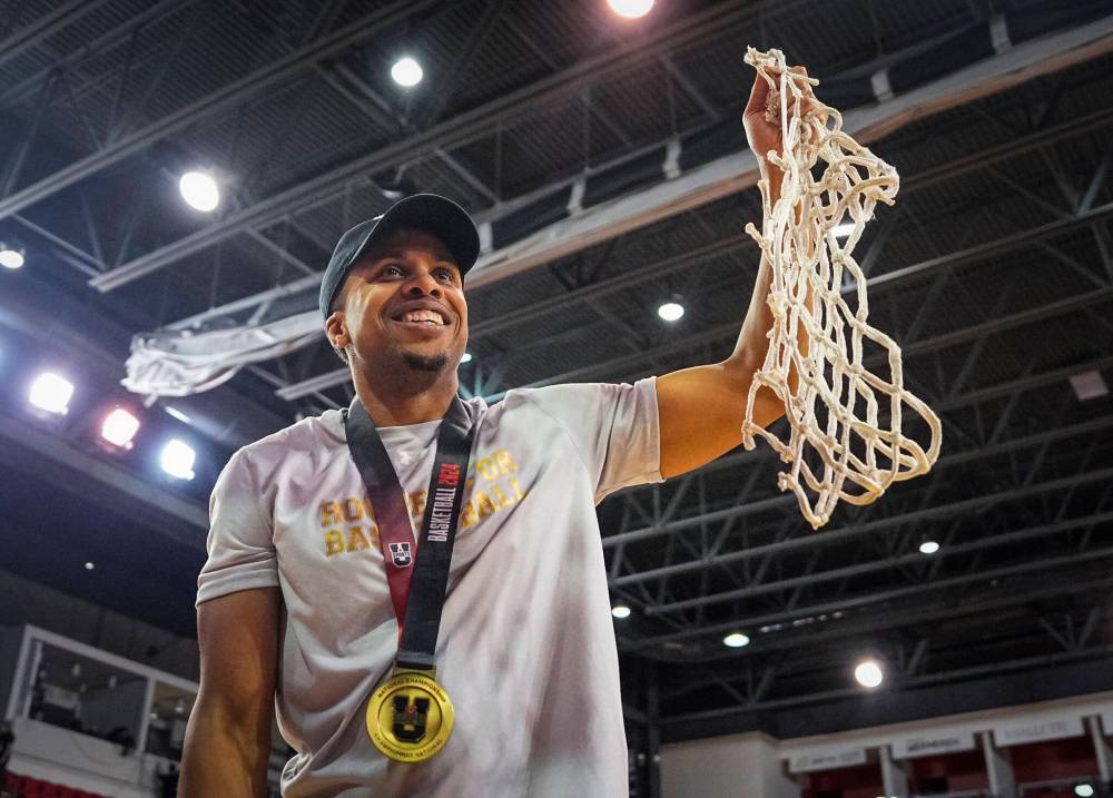 As a Brandon University Bobcat, Nathan Grant watched the Carleton Ravens cut down the nets after a U Sports title in 2007. He had his turn on Sunday, coaching the Laval Rouge et Or to their inaugural national men’s basketball crown. (Mathieu Bélanger/Rouge et Or)