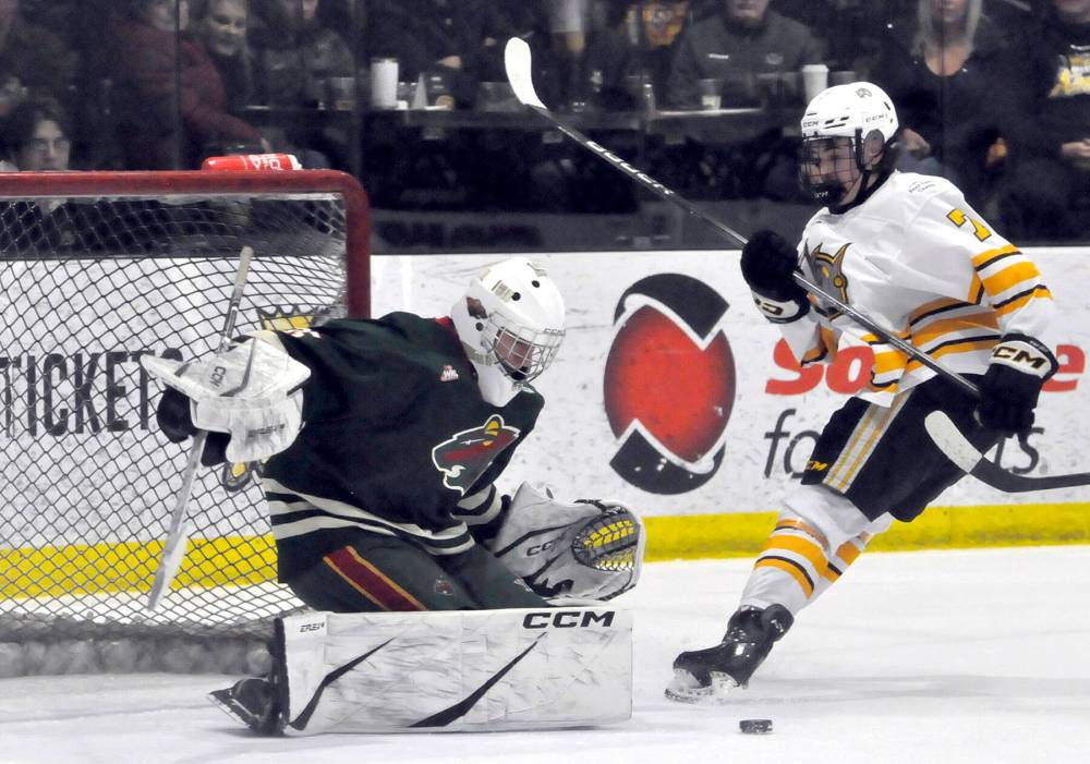 Brady Turko, shown earlier this season, scored the biggest goal of his hockey career in overtime in the west regional final on April 7 when he led Brandon to a 1-0 victory over the Saskatoon Blazers that sent them to the Telus Cup, which starts today in Cape Breton at the Membertou Sports and Wellness Centre. (Jules Xavier/The Brandon Sun)