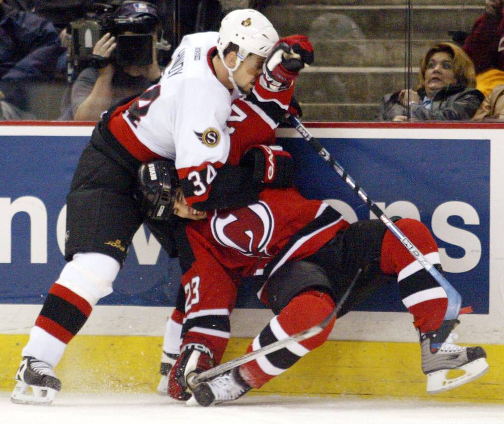 Ottawa Senators defenceman Shane Hnidy (left) puts New Jersey Devils forward Scott Gomez into the boards at the Corel Centre in Ottawa on Dec. 14, 2002. (The Canadian Press)
