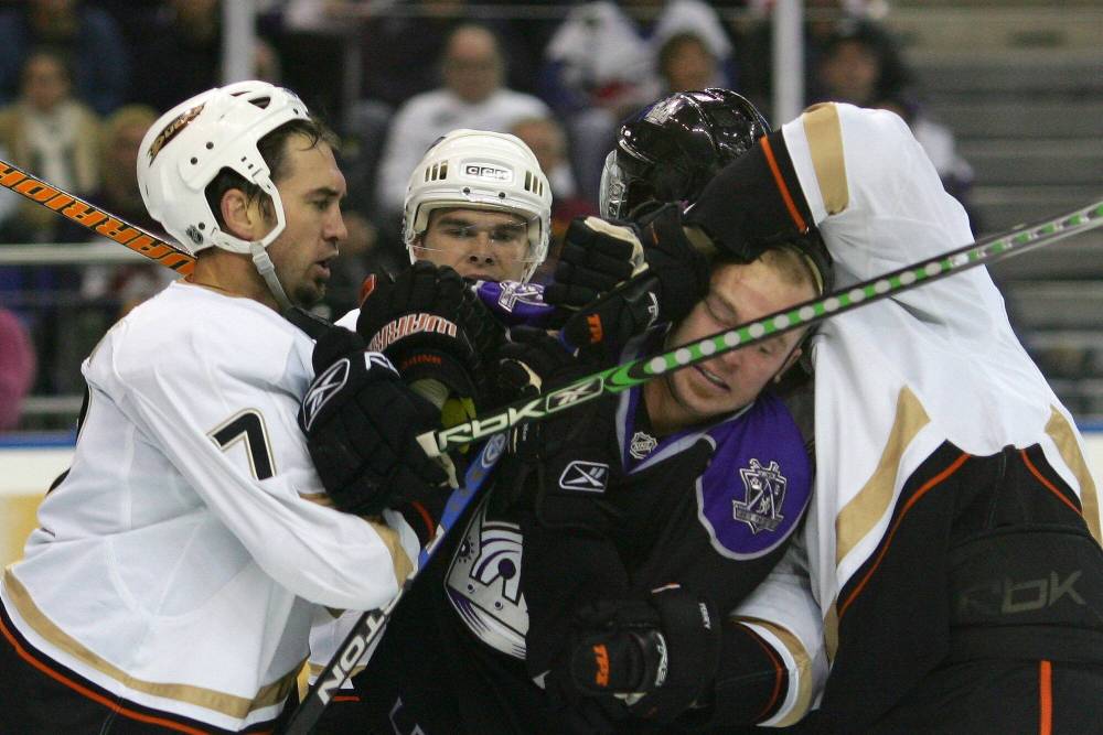 Los Angeles Kings forward Kyle Calder, second from the right, grapples with Anaheim Mighty Ducks defenceman Shane Hnidy, left, and Corey Perry during a National Hockey League game in London, England, on Sept. 29, 2007. It was the NHL’s first regular-season game in Europe. (Associated Press)