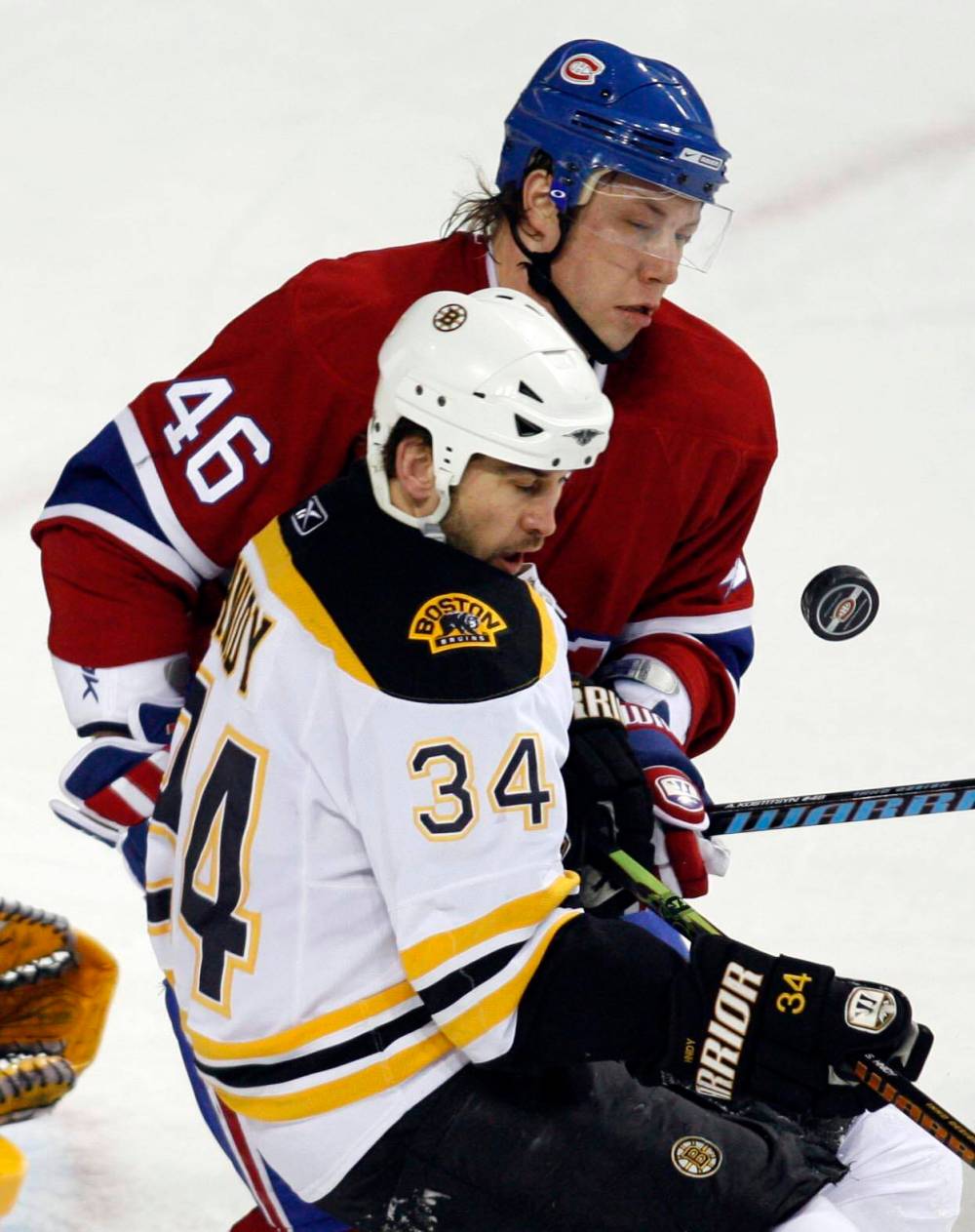 Shane Hnidy of the Boston Bruins and Andrei Kostitsyn of the Montreal Canadiens battle for the puck on March 22, 2008 at the Bell Centre in Montreal. (John Kenney/Montreal Gazette)