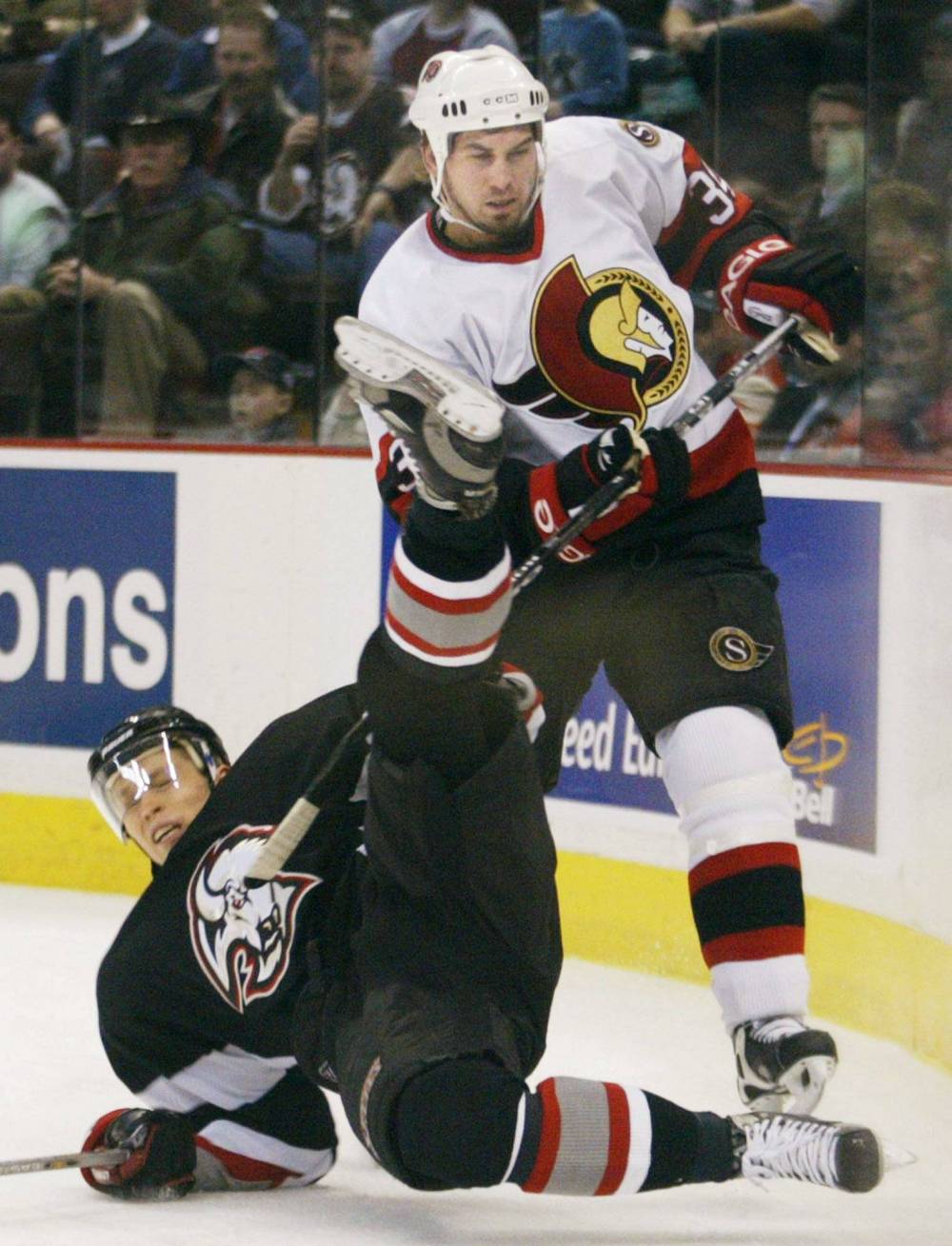 Buffalo Sabres forward Maxim Afinogenov trips as he and Ottawa Senators defnceman Shane Hnidy fight for control of the puck during National Hockey League action at the Corel Centre in Ottawa on March 24, 2002. (The Canadian Press)