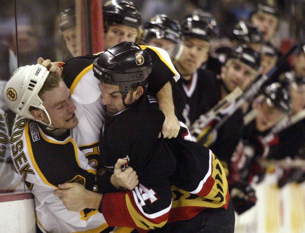 The Ottawa Senators bench watches while teammate Shane Hnidy fights Boston Bruins forward Michal Grosek in Ottawa on March 11, 2003. (The Canadian Press)