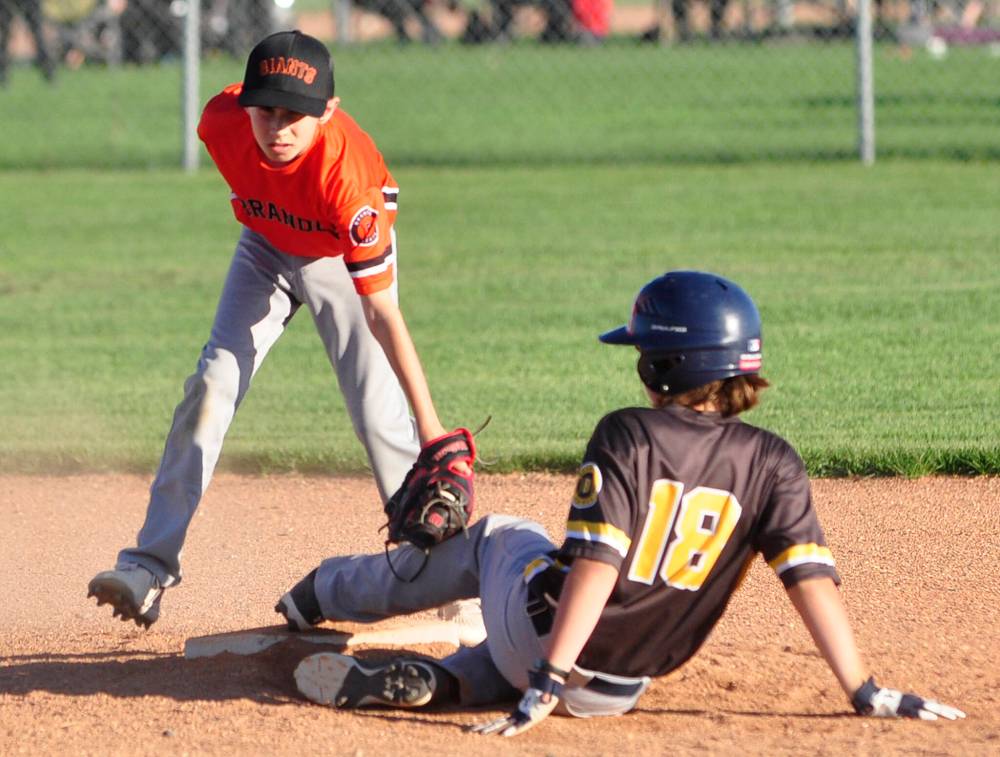 Safe at second — a Team Brown player slides safely into second base to beat the tag from his Team Orange opponent during the 13U Baseball Brandon house league championship game.