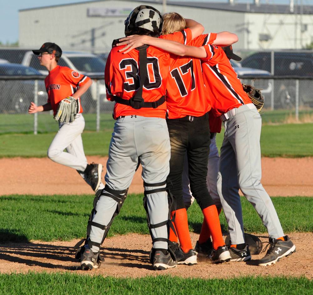 Team Orange players celebrate their 11-7 victory over Team Brown during the Baseball Brandon 13U house league championship game. With the win, Team Orange is off to Morden on July 12 for the three-day Tier 2 13U AA provincial tournament. Despite the loss, Team Brown earned a trip to Wawanesa for the Tier 3 13U AA provincials.
