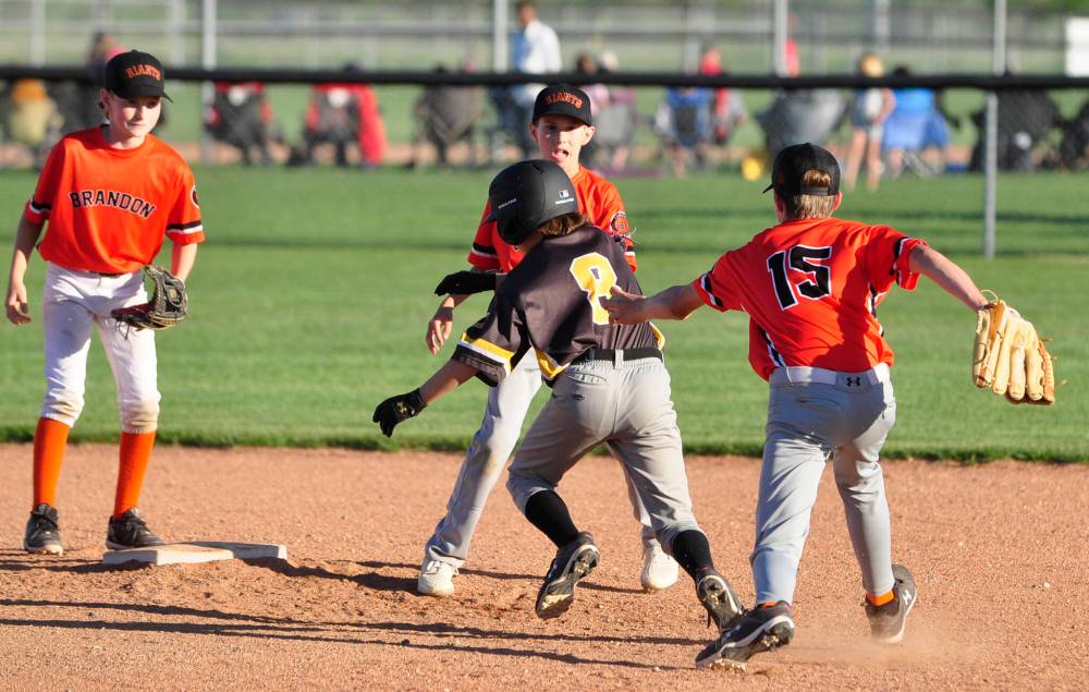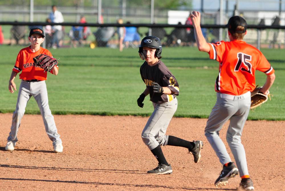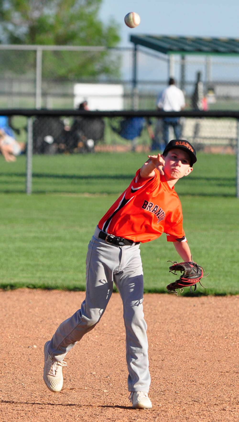 Team Orange’s second baseman relays the ball over to first base during a Baseball Brandon 13U championship game, which his team won 11-7 over Team Brown at Simplot Field.