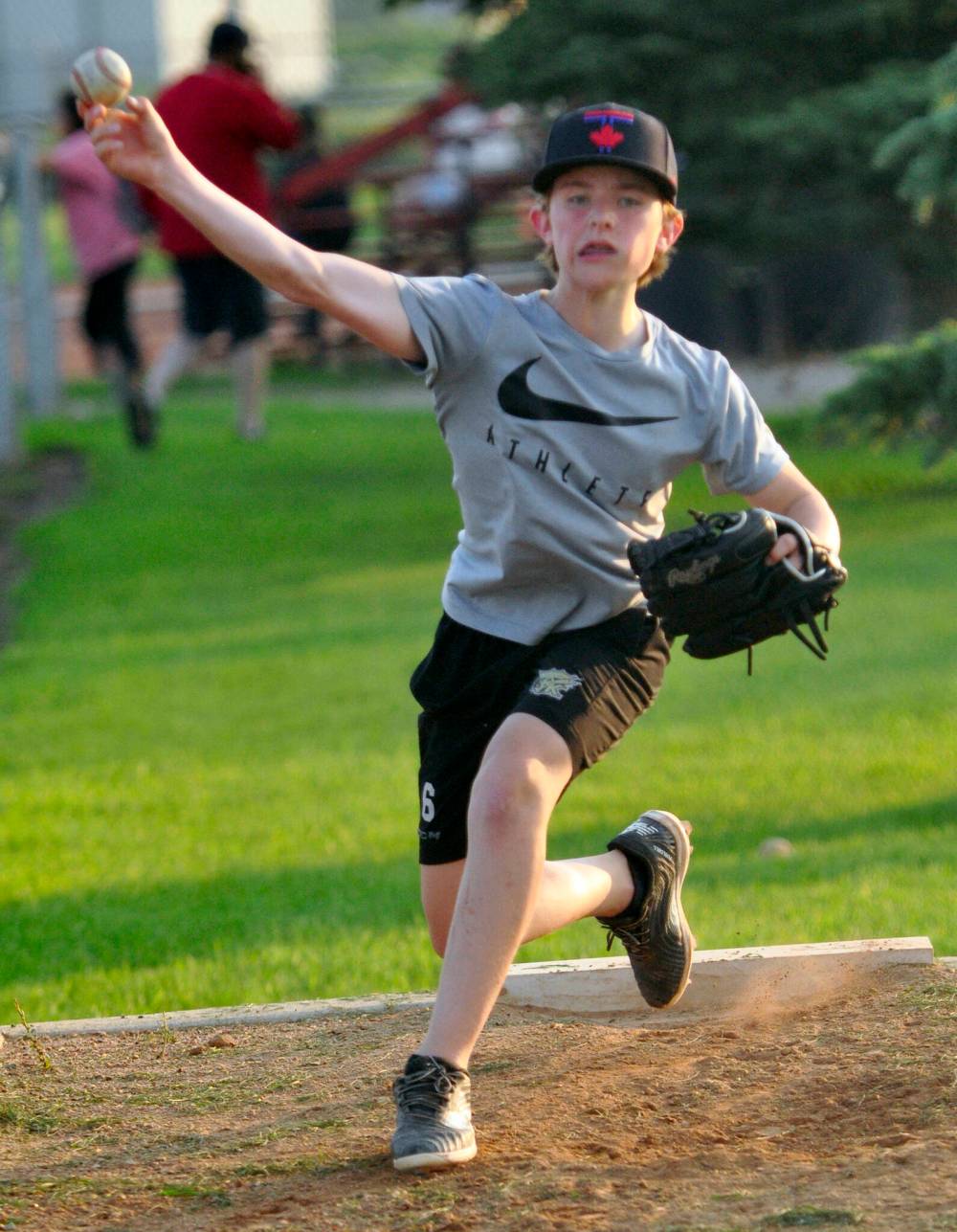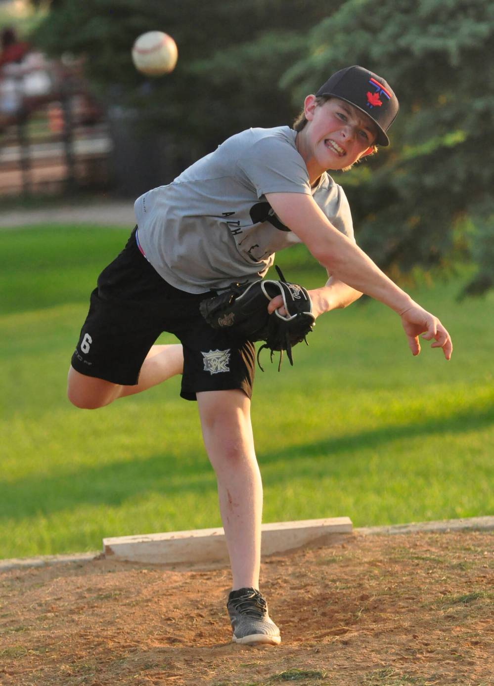 Team Orange players who won the Brandon Baseball 13U house league championship were honing their skills Monday night at Simplot Field to prepare for this weekend’s 13U Tier 1 provincials in Morden. Here, one of the Team Orange hurlers shows off his body language as he works on his pitches in the bullpen. (Photos by Jules Xavier/The Brandon Sun)