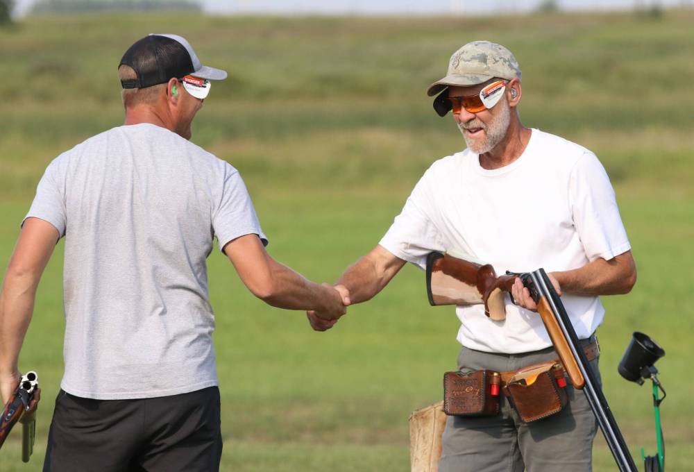 Rob Lamont, right, congratulates his son Pat after he shot a perfect 100 in doubles on Friday afternoon at the Brandon Gun Club during the Manitoba Trapshooting Association’s provincial championships. (Perry Bergson/The Brandon Sun) Aug. 24, 2024