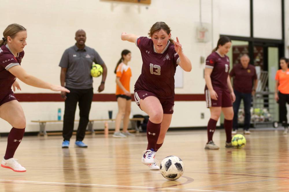 Katie Avison dribbles towards goal before an Assiniboine College women’s futsal scrimmage on Wednesday. (Thomas Friesen/The Brandon Sun)