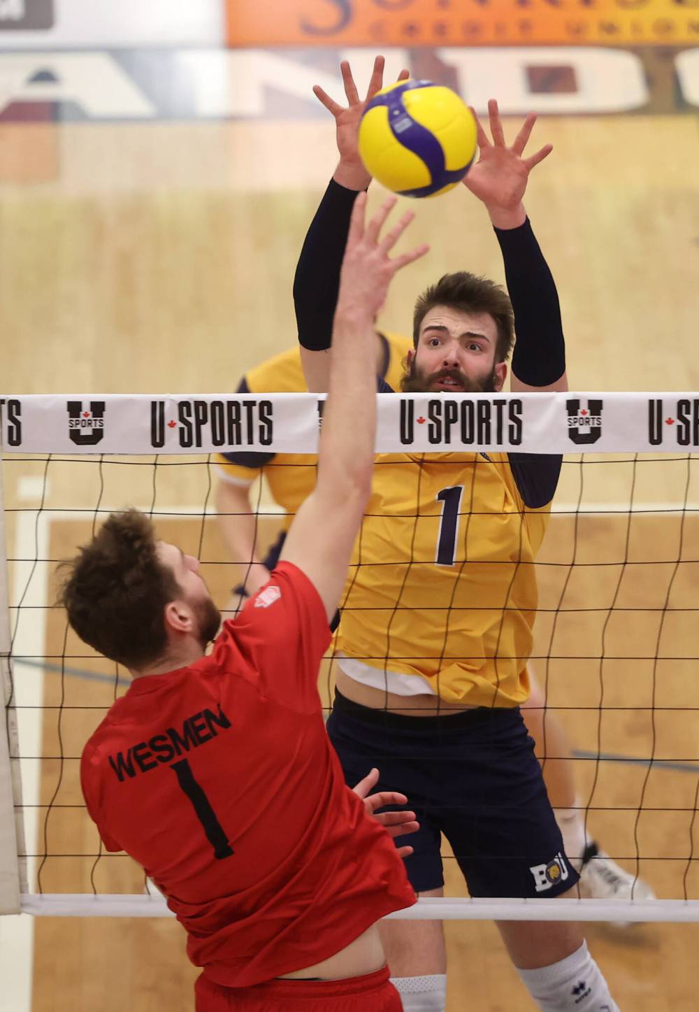 Philipp Lauter pounded the upset-sealing kill, sweeping the country’s No. 1-ranked University of Winnipeg Wesmen 3-0 (25-19, 25-19, 25-22) in the U Sports men’s volleyball championship quarterfinals.