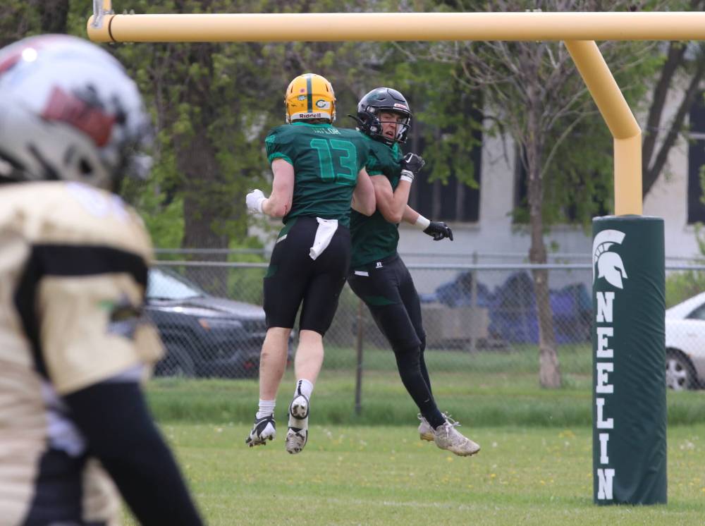Saskatchewan running backs Caden Gienow (27), right, celebrates his fourth-quarter major with Brodie Taylor (13) in the fifth edition of the annual Sask-Toba Challenge Cup at Neelin on Monday. (Perry Bergson/The Brandon Sun)