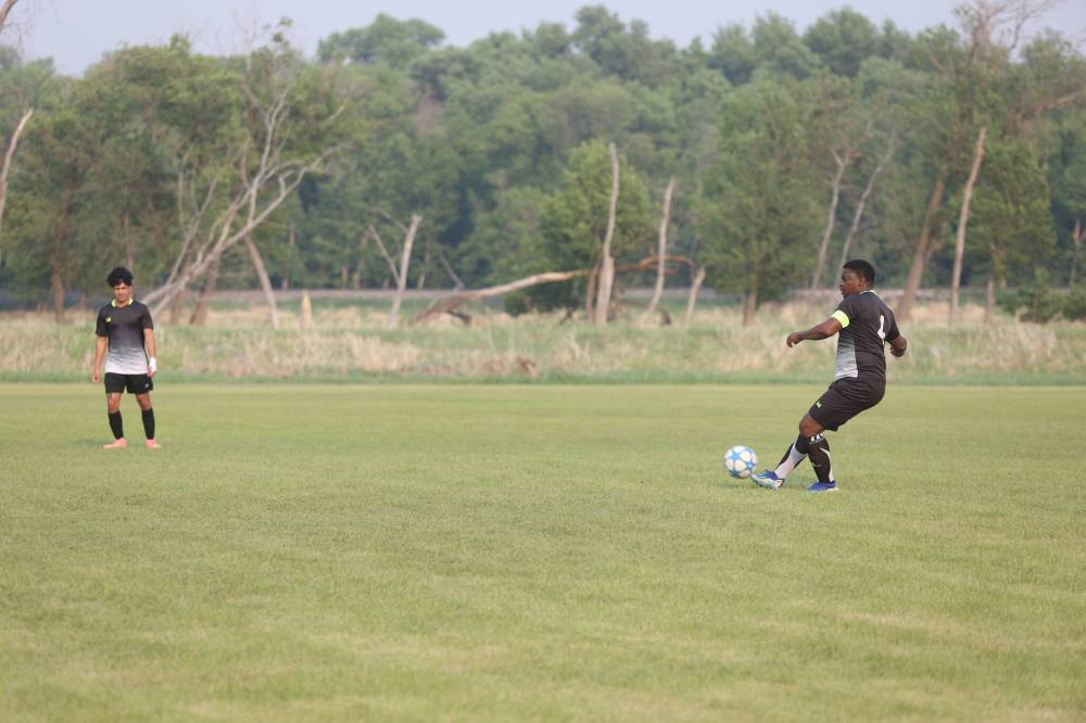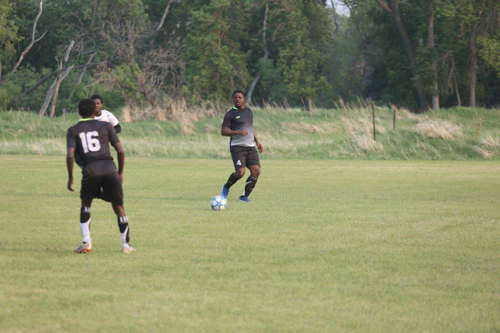 Wheelers FC captain Benjamin Ebose passes the ball to a teammate during the opening match against Warriors FC on Saturday evening at the Brandon Youth Soccer Association Park. The match ended in a 6–3 victory for Warriors FC.