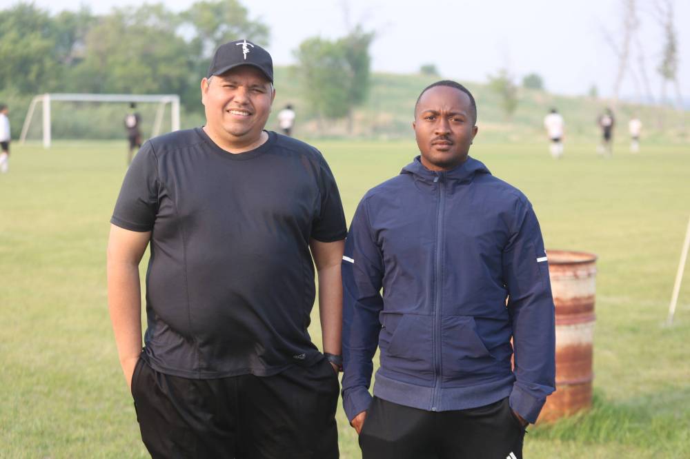 Prairie Mountain Soccer League president Josue Aleman (left) and treasurer Jordan Dill pose for picture during the opening match on Saturday evening.