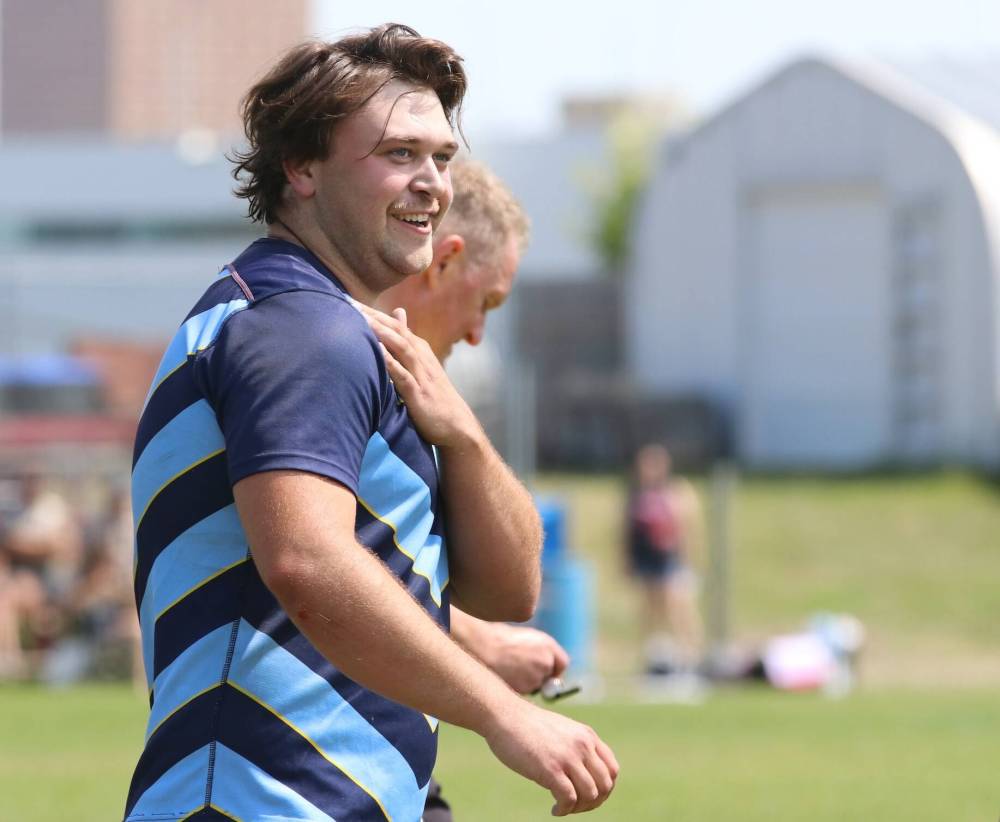 Randy Cooke of the Brandon Barbarians smiles as teammates hoot and holler after he scored the first try of his senior men's career as his club beat the visiting Manitoba Wombats in Premier Men's Division 2 action at John Reilly Field on Saturday afternoon. (Perry Bergson/The Brandon Sun)