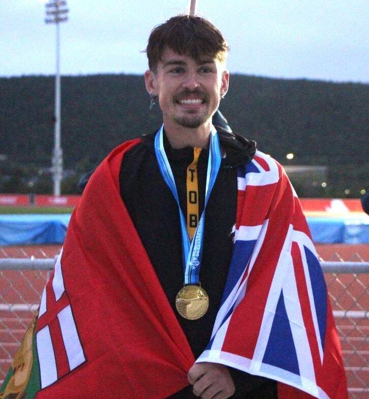 Daxx Turner poses with the gold medal he won in the triple jump at the Canada Summer Games on Friday in St. John's, N.L. He also won a bronze medal in the javelin. (Team Manitoba/Sport Manitoba)