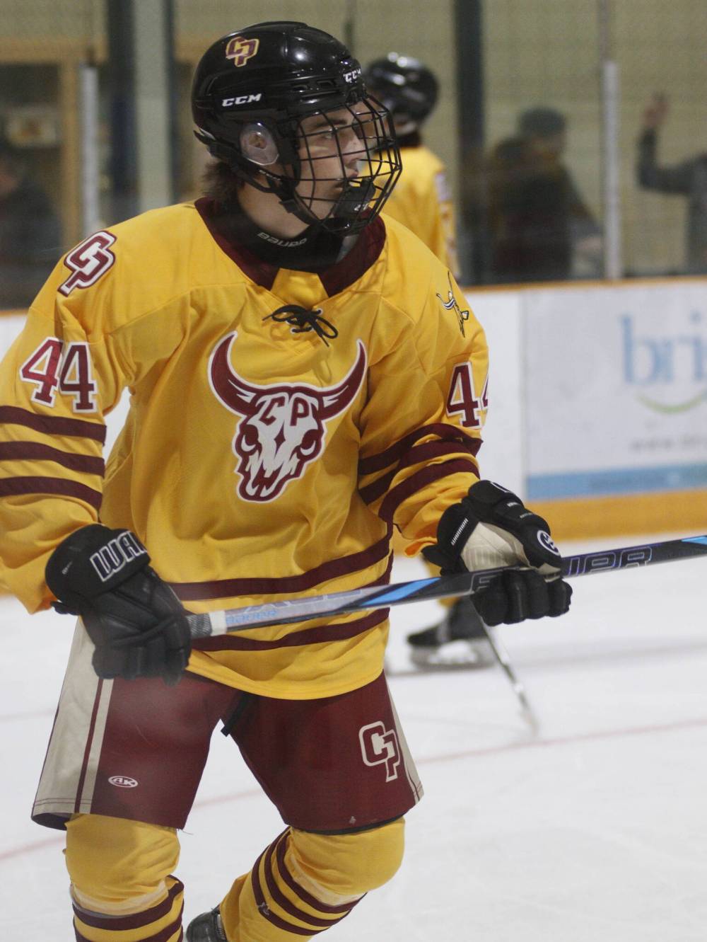 Riley Dutchak (44) of the Crocus Plainsmen prepares for his club’s home opener against the Vincent Massey Vikings at Enns Brothers Arena on Sunday afternoon. (Massimo De Luca-Taronno/The Brandon Sun)